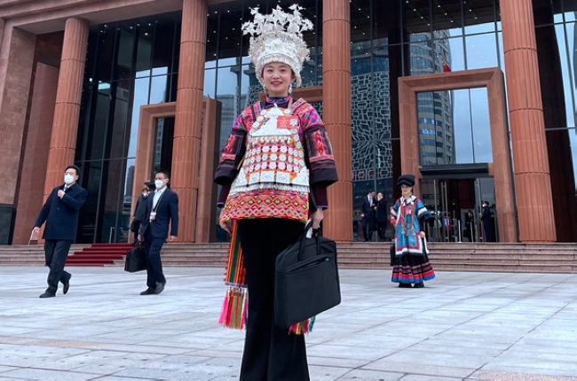 身著少數民族服裝的代表步入會場。 人民網記者 涂敏攝