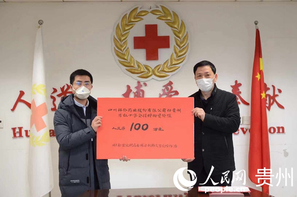 四川科倫藥業股份有限公司向貴州省紅十字會舉牌捐贈價值100萬元的物資。武雯 攝