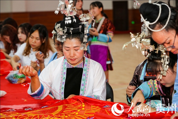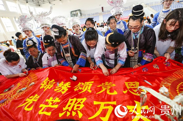 人民網貴陽6月30日電(陽茜) 6月29日,由貴陽人文科技學院、貴州省從江縣非物質文化遺產保護中心共同舉辦的“錦繡頌黨恩、光芒照萬丈”百名繡娘獻禮建黨100周年活動在貴陽舉行。來自從江縣30余名非物質文化遺產傳承人和該校近百名師生齊聚一堂,共同完成一幅主題為“錦繡頌黨恩、光芒照萬丈”的大型刺繡作品。