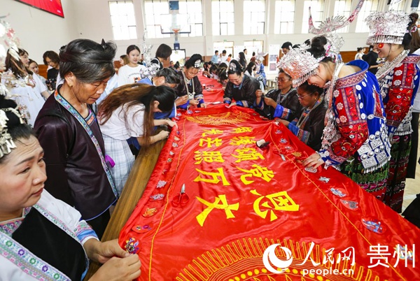 從江繡娘與學校師生共同繡制“錦繡頌黨恩 光芒照萬丈”刺繡作品 。人民網 陽茜攝