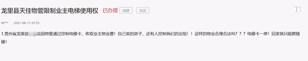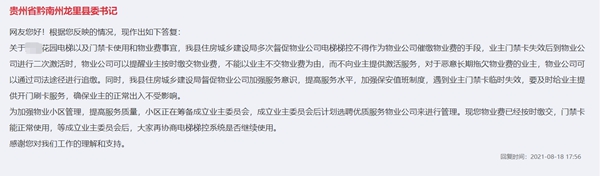 提示物業公司的同時,龍里縣住房和城鄉建設局也致電留言網友對辦理情況進行答復,并提醒業主也應履行業主義務,及時繳交物業費。該名網友表示,物業費已經按時繳交,門禁卡已能正常使用。