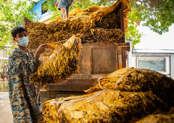 在十字鄉,煙農把烤煙送到收購站銷售。 龍永攝