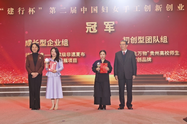 人民網貴陽12月27日電(王秀芳) 12月27日,第二屆中國婦女手工創新創業大賽頒獎儀式在貴陽舉行。經各環節激烈角逐,參賽選手吳婉菁的繡藝不息——國家級非遺夏布繡新時代高質量發展項目摘得成長型企業組冠軍桂冠,而初創型團隊組冠軍則花落貴州選手陳梅和潘淘潔的“匠·生萬物”貴州高校師生非遺文創品牌。至此,歷時半年的賽事圓滿落下帷幕。