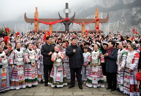 2021年2月3日至5日,中共中央總書記、國家主席、中央軍委主席習近平來到貴州考察調研,看望慰問各族干部群眾,向全國各族人民致以美好的新春祝福。這是3日下午,習近平在畢節市黔西縣新仁苗族鄉化屋村文化廣場上,向全國各族人民、港澳臺同胞和海外僑胞拜年。新華社記者 李學仁攝