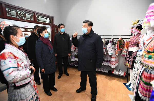 2021年2月3日至5日,中共中央總書記、國家主席、中央軍委主席習近平來到貴州考察調研,看望慰問各族干部群眾,向全國各族人民致以美好的新春祝福。這是3日下午,習近平在畢節市黔西縣新仁苗族鄉化屋村扶貧車間,了解發展特色苗繡產業、傳承民族傳統文化等情況。新華社記者 謝環馳攝
