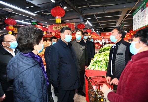 2021年2月3日至5日,中共中央總書記、國家主席、中央軍委主席習近平來到貴州考察調研,看望慰問各族干部群眾,向全國各族人民致以美好的新春祝福。這是4日下午,習近平在貴陽市觀山湖區合力惠民生鮮超市同置辦年貨的群眾親切交流。新華社記者 謝環馳 攝
