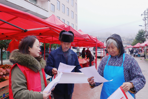 開陽縣高寨鄉集鎮依托趕集日向過往群眾發放治風倡議書。開陽縣委宣傳部提供