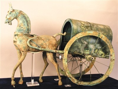 漢武帝時期,掀起開發“西南夷”大潮,夜郎等地被納入漢王朝行政管理體系。漢代銅車馬是貴州省博物館的“鎮館之寶”。這件銅車馬出土于貴州興義萬屯漢墓,整車由大約300個零部件組成,是迄今為止漢墓出土銅車馬中最完整、最精致的一件,對了解漢代車制、冶煉工藝具有重要價值。銅車馬呈馬拖車狀,馬蹄微微向前,步態優雅,馬嘴微張,作嘶鳴狀。車為雙曲轅車,車篷用青銅卷曲成覆瓦狀,厚度僅0.1毫米,輕薄如紙。