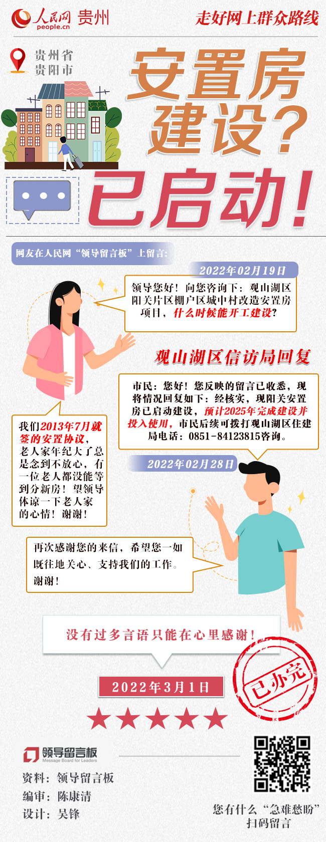 看到留言后,觀山湖區信訪局就網友關心的問題回復稱,現陽關安置房已啟動建設,預計2025年完成建設并投入使用。為方便后續咨詢,此次回復還公布了觀山湖區住建局的聯系電話。