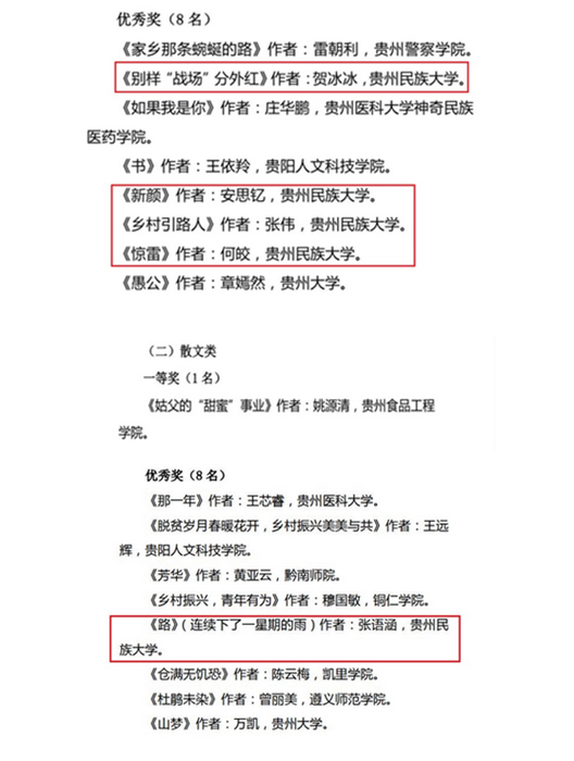 貴州民族大學團委高度重視此項工作,認真組織青年學子深入學習2022年中央一號文件精神,結合習近平總書記賦予貴州“闖新路、開新局、搶新機、出新績”的重大使命,撰寫詩歌、散文,積極投稿。經相關專家進行初篩、初選和終評,我校學子的作品在2000 余件參賽作品中脫穎而出。(貴州民族大學黨委宣傳部)