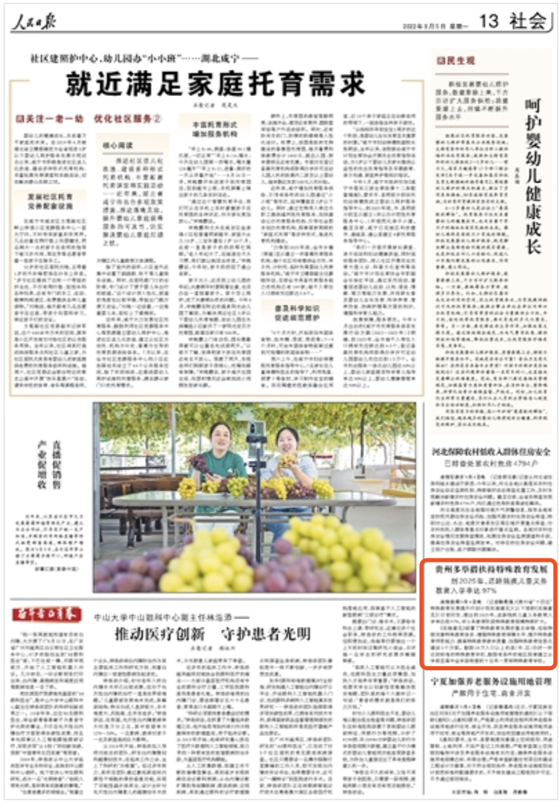 本報貴陽9月4日電??(記者陳雋逸)《貴州省“十四五”特殊教育發展提升行動計劃實施意見》(以下簡稱《實施意見》)日前印發,提出到2025年,適齡殘疾兒童義務教育入學率達到97%,非義務教育階段特殊教育規模持續擴大。