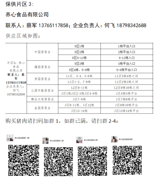 花果園片區將劃定5個售賣區域,每家售賣企業負責一個區域內豬肉點對點供應。居民如有需求,可根據自己居住的區域掃碼入群,定向下單。企業在接到訂單后將嚴格按照高、中、低風險區物資配送流程,全面實現無接觸配送。(文/圖?王麗霞)