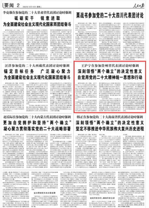 新華社北京10月17日電 王滬寧同志17日上午在參加他所在的黨的二十大貴州省代表團討論時表示,要堅持以習近平新時代中國特色社會主義思想為指導,深刻領悟“兩個確立”的決定性意義,增強“四個意識”、堅定“四個自信”、做到“兩個維護”,自覺用黨的二十大精神統一思想和行動,為全面建設社會主義現代化國家而團結奮斗。