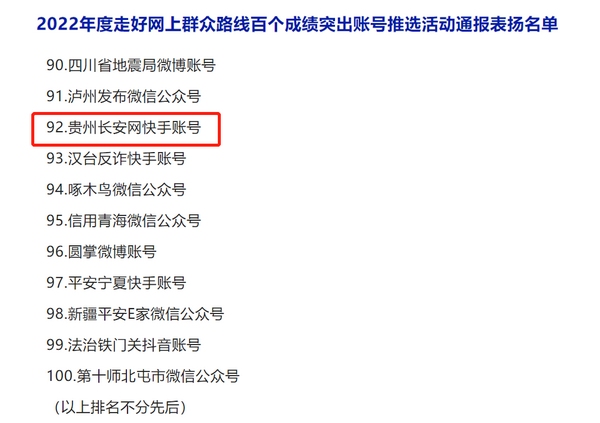 人民網貴陽1月18日電? (王秀芳)1月18日,記者從貴州省委網信辦獲悉,中央網信辦近日對2022年度走好網上群眾路線百個成績突出賬號及優秀組織單位予以通報表揚。其中,“貴州長安網快手賬號”被通報表揚,貴州省委網信辦獲評優秀組織單位。