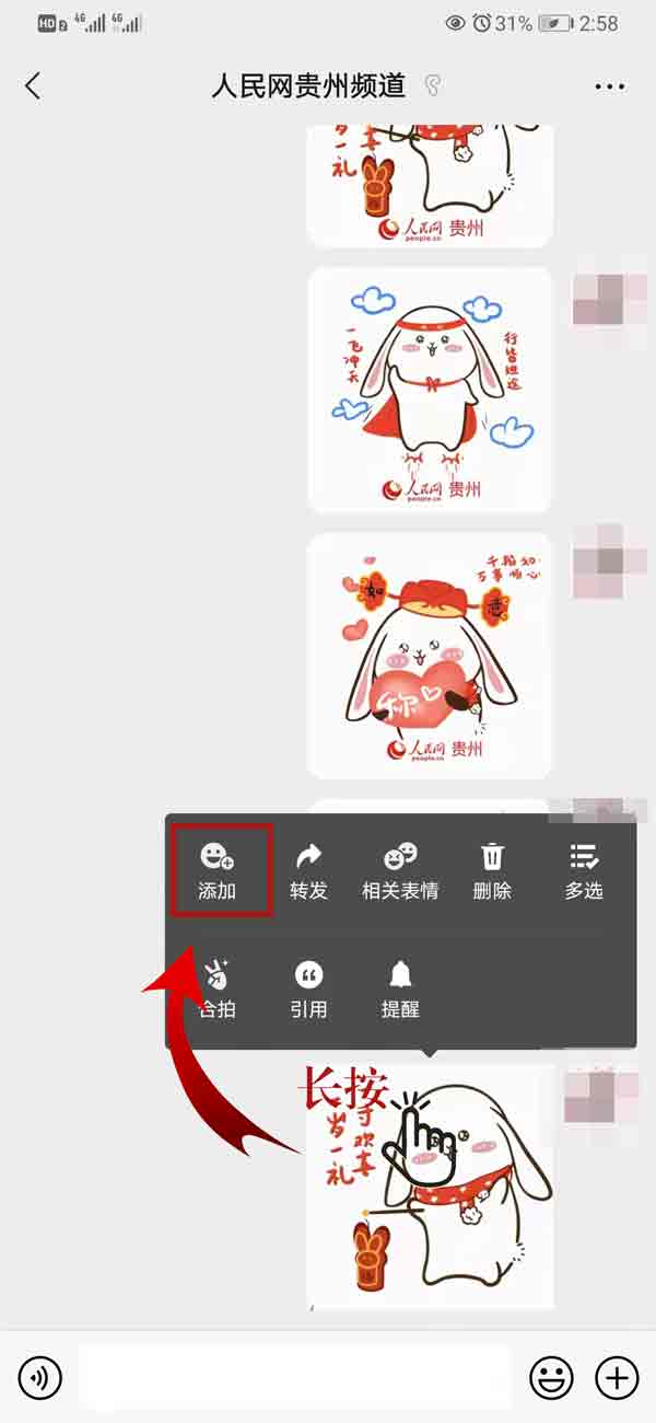 2、手機端:第一次使用時,微信打開本文,在文中長按表情即可“轉發給朋友”;隨后在聊天對話框長按表情“添加”即可保存長期使用。