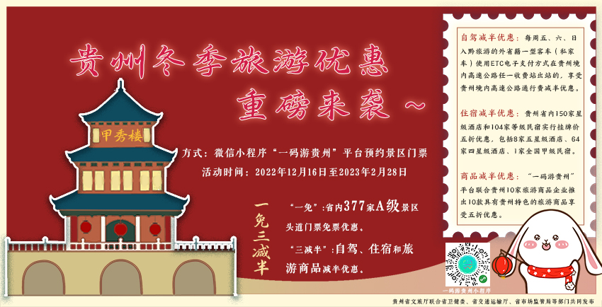 不再查核酸、取消落地檢、行程碼下線……當煙火氣回歸,又遇兔年春節長假,人們不遠千里回到家鄉,在熱鬧的爆竹聲中出游意愿更為強烈。過年去哪玩?哪的優惠大?滑雪溫泉要安排!除了冬游貴州“一免三減半”的優惠政策,還有部分地方推出的冬游優惠政策,可謂是“折上折”??靵硎障逻@份貴州春節旅游指南吧!