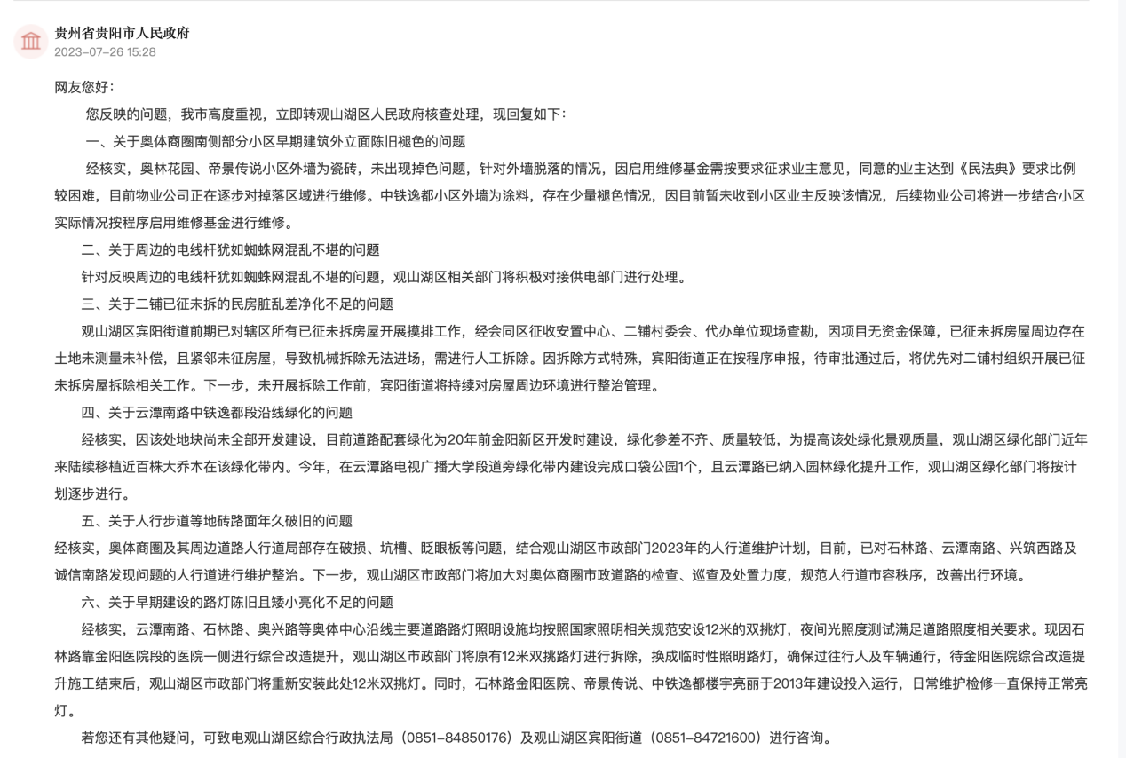 收悉網友留言后,貴陽市人民政府高度重視,立即轉觀山湖區人民政府核查處理,并對上述問題逐一作辦理回復。