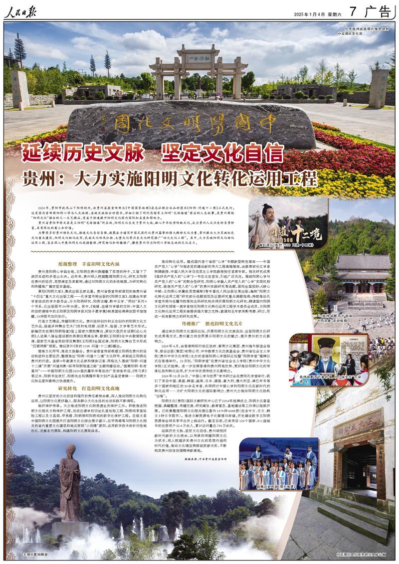 為繁榮多彩貴州特色文化,推進文化自信自強,凝聚奮力譜寫中國式現代化貴州篇章的強大精神文化力量,貴州提出大力實施紅色文化重點建設、陽明文化轉化運用、民族文化傳承弘揚、屯堡文化等歷史文化研究推廣“四大文化工程”。其中,大力實施陽明文化轉化運用工程,旨在深入開展陽明文化挖掘整理、研究轉化和傳播推廣,擦亮貴州作為陽明心學誕生地的文化名片。