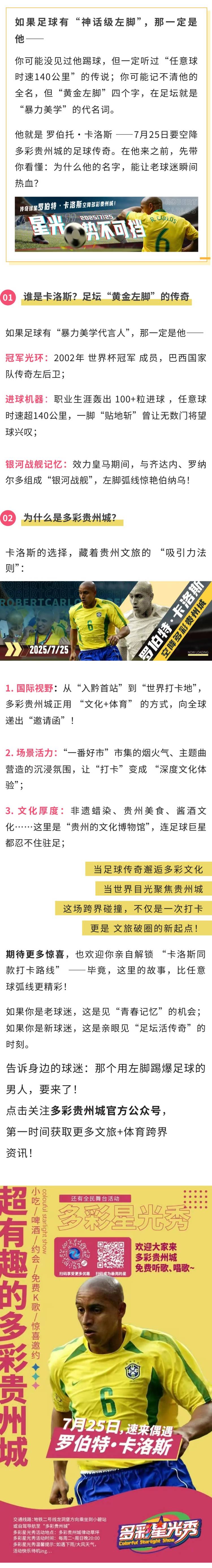 7月25日,巴西足球傳奇卡洛斯將閃現多彩貴州城!