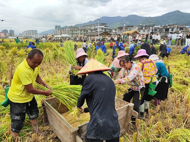 在分會場三寶侗寨又是另一番熱鬧景象,稻田里,渾水摸魚、打谷比賽、水田捕鴨、徒手抓豬等趣味農事活動引來陣陣歡笑。參賽者卷起褲腿,跳進水田,重現傳統農耕生活的場景。當地農民吳文勝抹去臉上的泥水,卷起褲腿,笑著說:“同慶豐收,活動樂趣多多!”