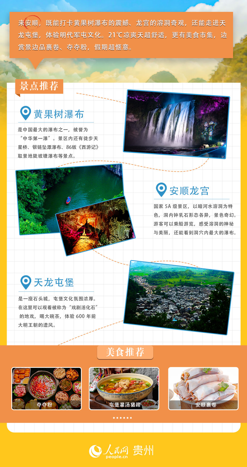 國慶與中秋雙節同慶,正是出游好時節。貴州,這片充滿魅力的土地,正敞開懷抱,等待著八方游客。這里有壯麗的自然景觀,如黃果樹瀑布的磅礴、梵凈山的巍峨;有底蘊深厚的歷史文化,像青巖古鎮的古樸、海龍屯的滄桑;還有獨具風味的特色美食,酸湯魚、絲娃娃等讓人垂涎欲滴。無論是想領略大自然的鬼斧神工,還是探尋歷史的印記,亦或是大快朵頤,貴州都能滿足你。這個假期,就讓我們一路向“黔”,解鎖黔地風情,開啟一場難忘的貴州之旅。