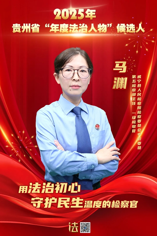 馬淵,女,現任威寧縣檢察院檢察委員會專職委員、第五檢察部主任、一級檢察官。十四年來,她扎根基層檢察一線,從偵查監督、職務犯罪辦案到控告申訴崗位,始終以堅定的法治信仰、精湛的業務能力和深厚的為民情懷,踐行著“努力讓人民群眾在每一個司法案件中感受到公平正義”的初心使命。2022年以來,她先后榮獲貴州省“先進工作者”、畢節市控告申訴檢察“業務標兵”、市級“先進工作者”等多項榮譽。