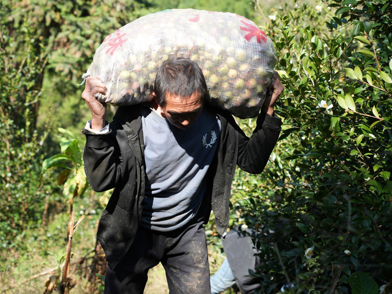 油茶“一次種植、多年受益”,穩定收獲期可達數十年,其果實制成的茶籽油有“東方橄欖油”之稱,兼具食用、醫用與美容價值。為解決村民“賣果難”問題,今年該鎮打出了一套產業服務“組合拳”:依托鎮屬強村富民公司搭建產銷橋梁,提前與外地客商敲定保底價,設立統一收購點,各村統籌集中裝車,大幅降低村民運輸成本,提升收購效率,確保油茶果及時交付,解除種植戶的后顧之憂。